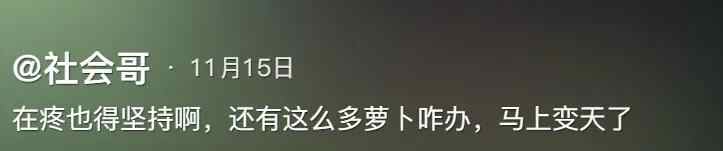 其11月15日发布的视频配文:再疼也得坚持阿!还有这么多萝卜咋办,马上变天了。视频中他和朋友还透露,昨日凌晨3点还在医院里,是打了止疼针来带货直播的。