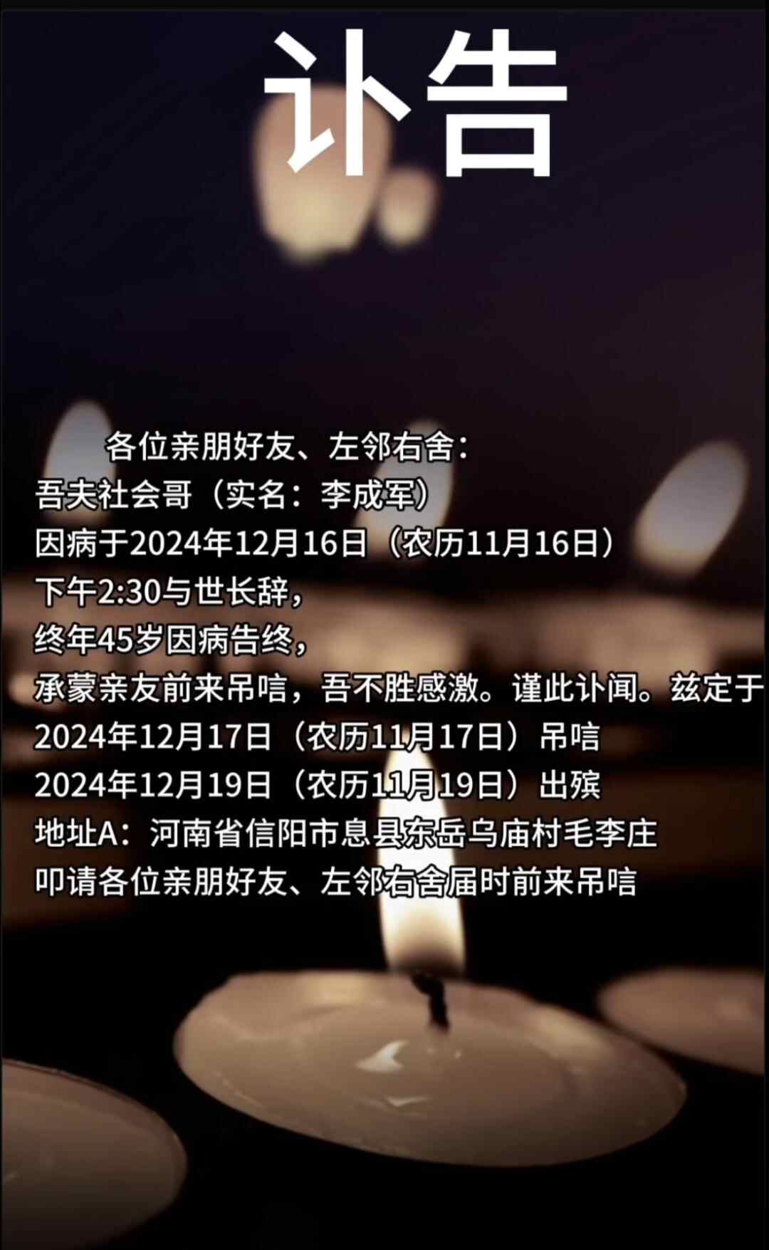 12月16日晚,河南息县的知名网红“社会哥”不幸去世,终年45岁。其账号以妻子的名义发布讣告。讣告称“社会哥”因病于2024年12月16日下午2时30分与世长辞。
