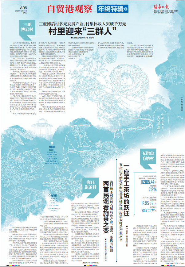 12月的三亚,暖意融融。走进三亚市吉阳区博后村,青山绿水间,一幢幢精品民宿错落有致。成群结队的游客漫步在宽敞的村道上,或入住特色民宿,或到哎岬湖畔拍照“打卡”,或品尝博后村夜市的特色美食,人来人往,让冬日里的村庄热气腾腾。