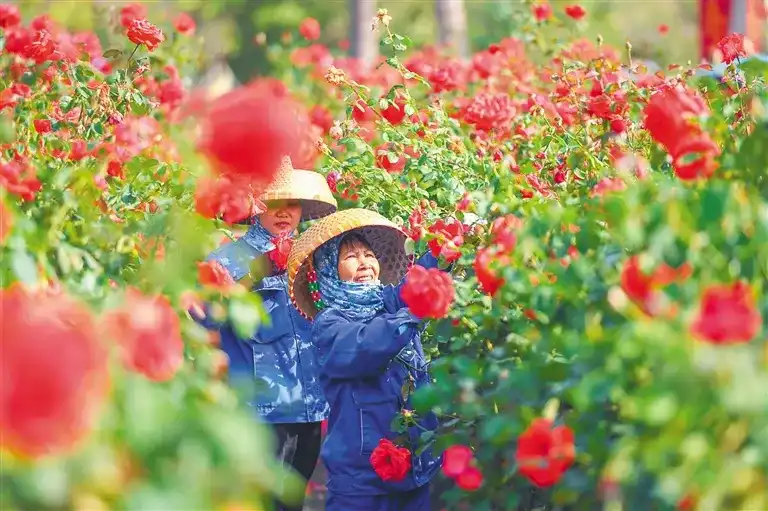 位于三亚博后村的海南玫瑰谷产业发展有限公司种植基地,花农忙着管护鲜花。 (资料图)