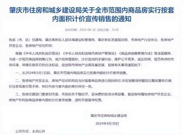 今年4月,广东省肇庆市住房和城乡建设局发布《关于全市范围内商品房实行按套内面积计价宣传销售的通知》(以下称《通知》)。