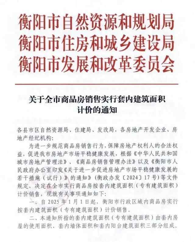 12月12日,衡阳市自然资源和规划局、衡阳市住房和城乡建设局、衡阳市发展和改革委员会联合发布《关于全市商品房销售实行套内建筑面积计价的通知》。明确自2025年1月1日起,衡阳市商品房销售实行套内建筑面积计价。