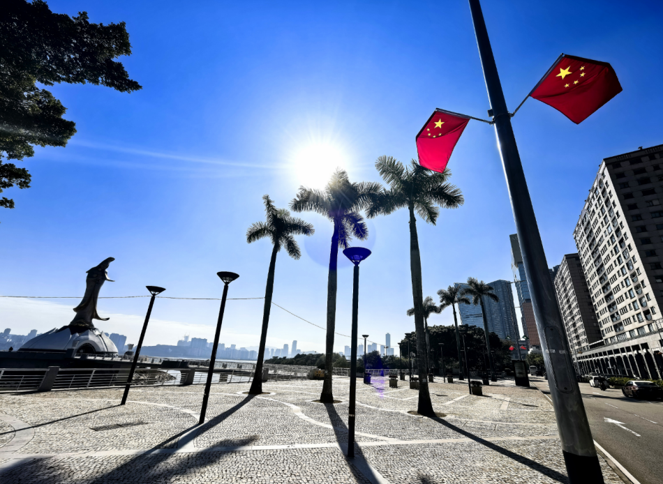 12月18日,澳门街头随处可见庆祝澳门回归祖国25周年的元素,国旗及特区区旗随风飘扬。(海外网 牛宁 摄)