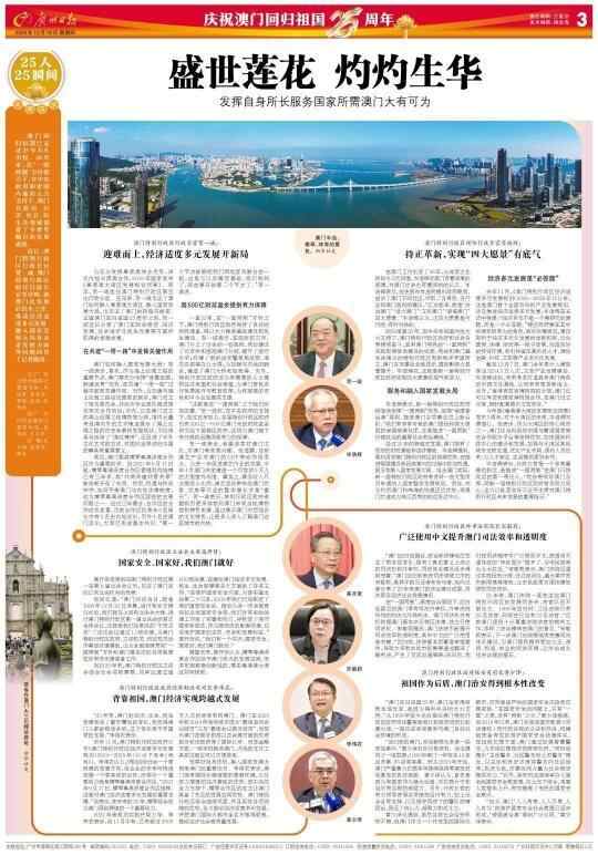 澳门回归祖国已走过25年不凡历程。25年来,在“一国两制”方针指引下,在中央政府和祖国内地的大力支持下,澳门在政治、经济、社会、民生各领域创造了令世界瞩目的发展成就。