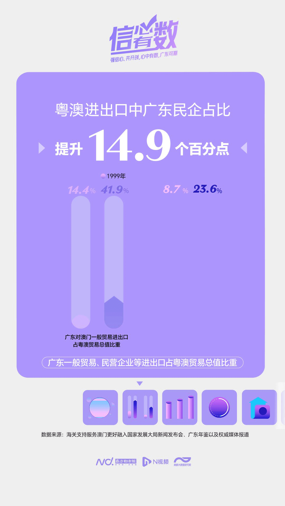 数据显示,今年前10个月广东对澳门一般贸易进出口比重较1999年提升52.3个百分点,一般贸易比重显著提升。广东各类贸易主体对澳门进出口值均保持增长。其中,民营企业进出口占粤澳贸易总值的44.9%,比重较1999年提升28.3个百分点。