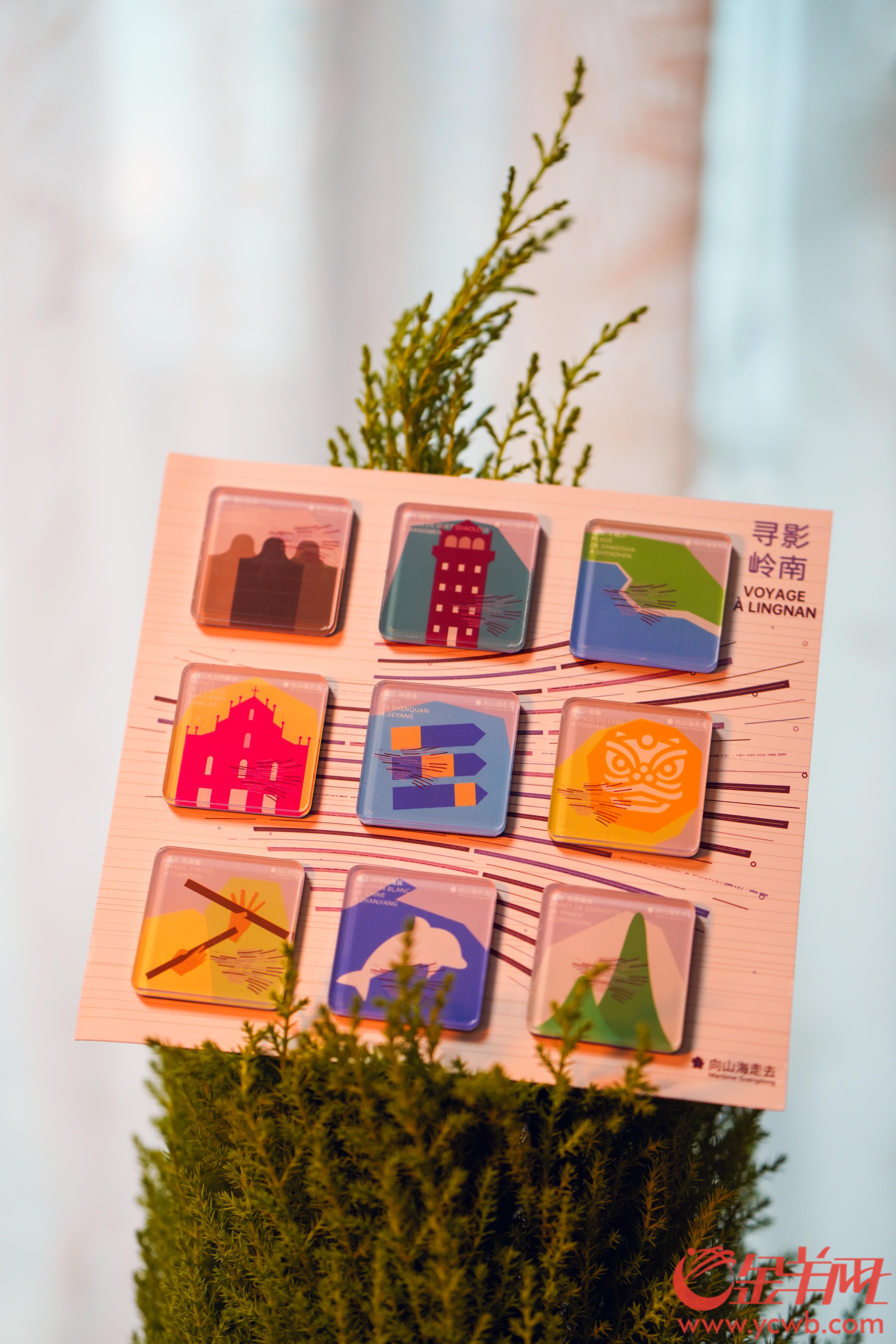 山海展映季·巴黎活动期间,山海计划为法国观众带来一套限定周边,其中“寻影岭南”冰箱贴套装设计提取了9部短片9个取景地的特色地标和文化符号,包括广州花都塱头古村、湛江中华白海豚、佛山南狮、澳门大三巴牌坊、揭阳神泉港、深圳大梅沙盐田港、清远英西峰林、江门碉楼、汕头英歌舞等,创意展示气象万千的岭南风光。