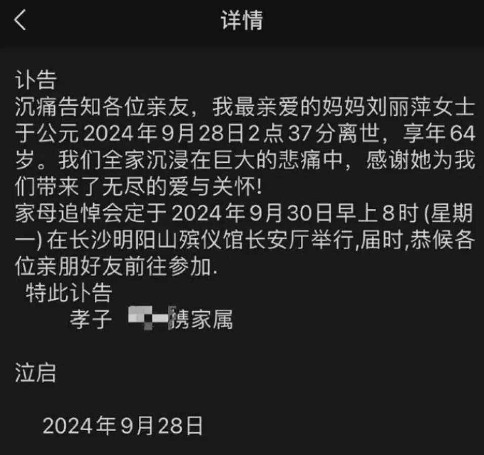 网传其家属发布的讣告显示,刘丽萍于9月28日2点37分离世,享年64岁。新湖南客户端发布消息后,该话题冲上热搜,网友们纷纷表示震惊和惋惜。