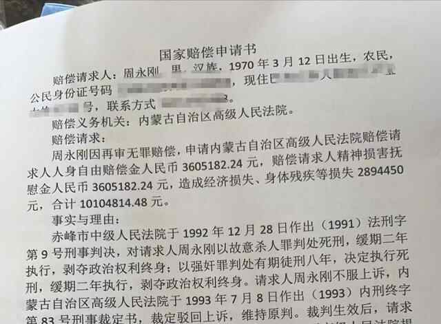 今年5月,周永刚向内蒙古自治区高院国赔委递交《国家刑事赔偿申请书》,除经济赔偿外,周永刚还要求赔偿义务机关在内蒙古自治区范围内公开为其消除影响、赔礼道歉,恢复名誉。