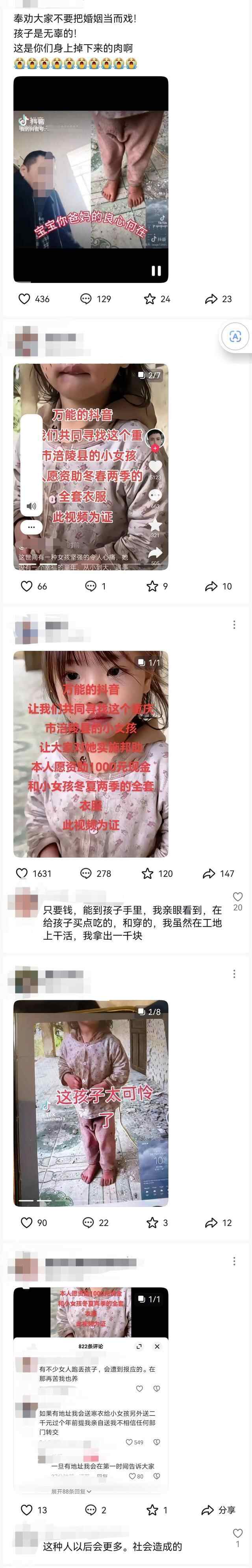 视频中,一个小女孩衣着单薄、双手长满了冻疮,赤脚站在地上,引发不少网友评论,“孩子是无辜的”“有谁知道这个可怜的小孩在哪”“大家都来献出一份情,让世间充满爱”“孩子的地址有吗”……