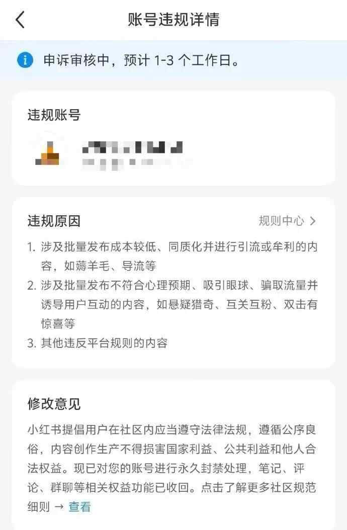 一位被封号的网友收到的小红书官方通知称,其违规原因是“在笔记或评论中频繁采用刻意夸大事实、编造故事、题文不符等低质量营销手法来推广商品或服务,以及在笔记或评论中频繁将其他用户引导至第三方平台,”并被通知账号已被永久限制账号流量与商业权益。