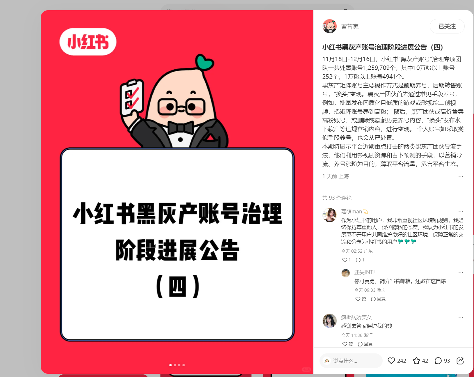 小红书官方账号“薯管家”近日发布了“黑灰产账号”治理阶段进展公告。其中提到,11月18日-12月16日,小红书“黑灰产账号”治理专项团队一共处置账号1259709个,其中10万粉以上账号252个,1万粉以上账号4941个。
