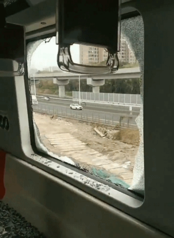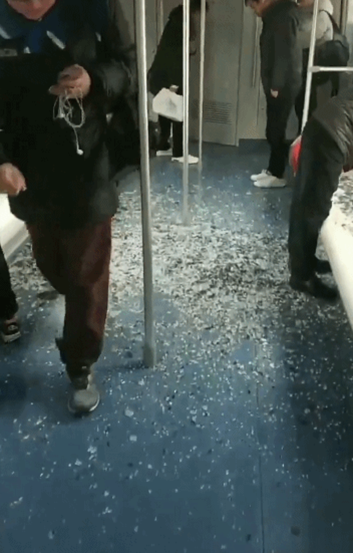 网传视频显示,事故列车内一扇车窗破裂,车厢内一地玻璃渣。
