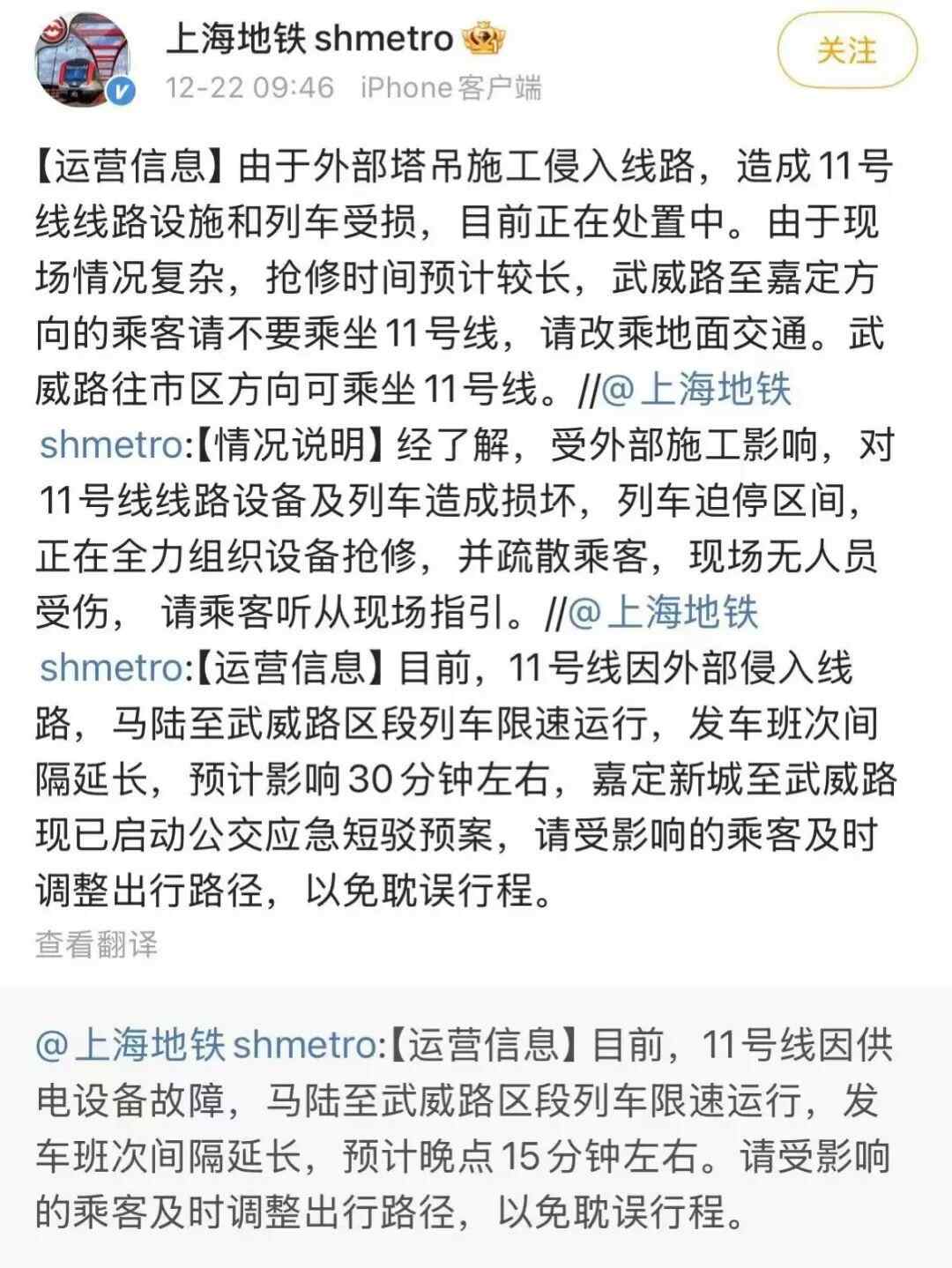 9时46分,@上海地铁shmetro 更新最新情况:由于外部塔吊施工侵入线路,造成11号线线路设施和列车受损,目前正在处置中。由于现场情况复杂,抢修时间预计较长,武威路至嘉定方向的乘客请不要乘坐11号线,请改乘地面交通。武威路往市区方向可乘坐11号线。