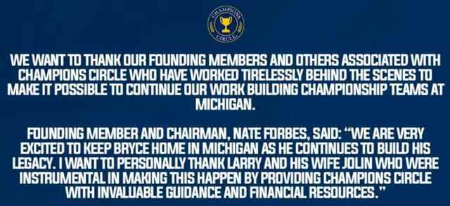 密歇根大学支持者组织冠军圈(Champions Circle)兴奋地发表声明,感谢埃里森和他的妻子Jolin为这一成就提供了宝贵的指导和财政资源。