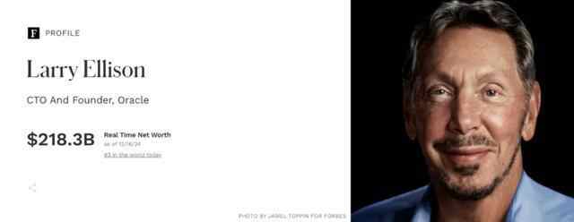 拉里·埃里森的实时身家为2183亿美元,排名世界第三
