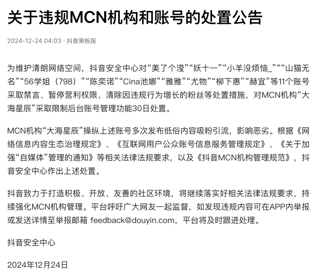 公告称,MCN机构“大海星辰”操纵上述账号多次发布低俗内容吸粉引流,影响恶劣。根据《网络信息内容生态治理规定》、《互联网用户公众账号信息服务管理规定》、《关于加强“自媒体”管理的通知》等相关法律法规要求,以及《抖音MCN机构管理规范》,抖音安全中心作出上述处置。