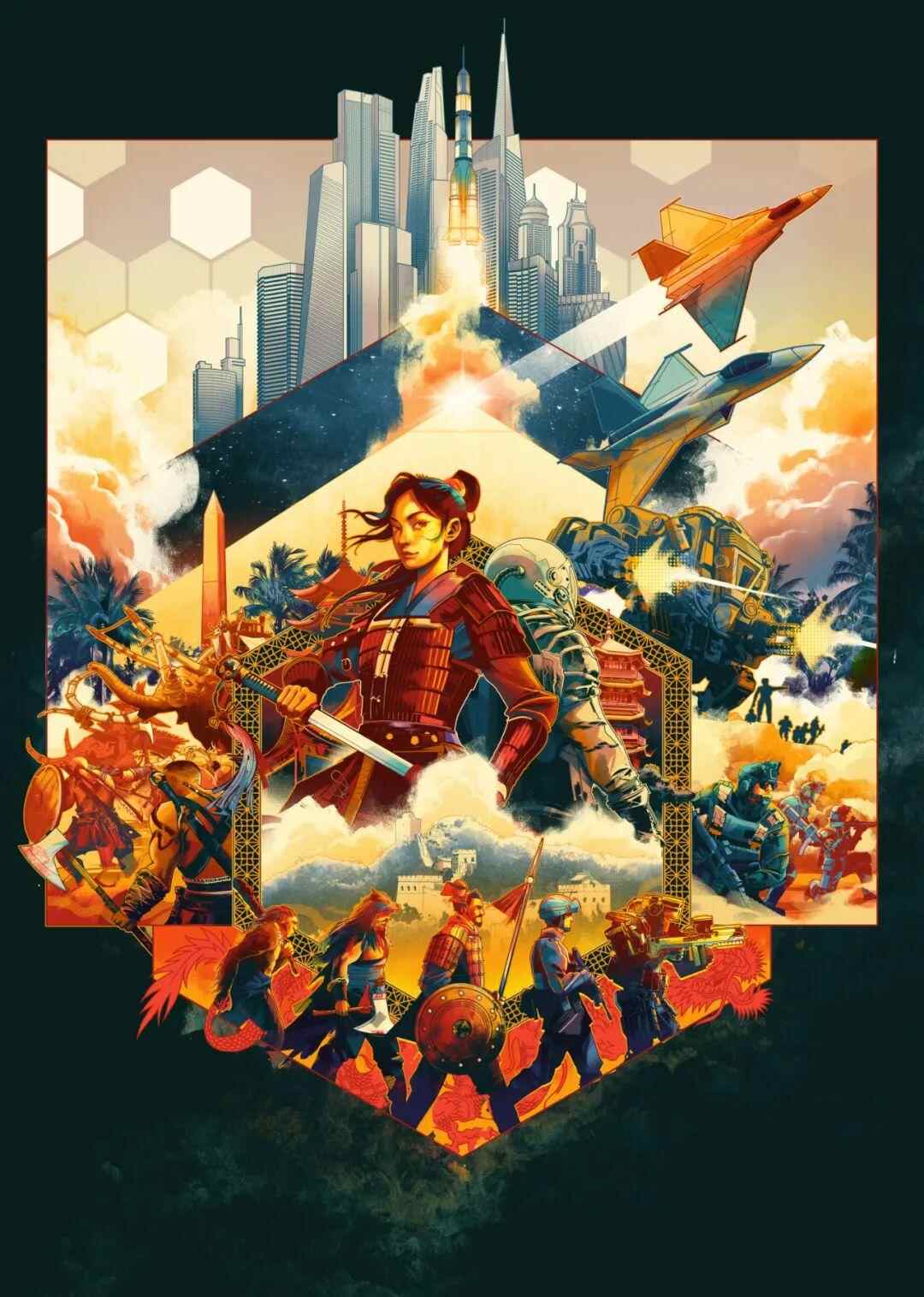 从《世界启元》发出的视频可以了解到,这是Matt Taylor首次为电子游戏产品进行海报创作,他以《文明》系列最典型的六角形格子作为视觉中心,将中国的长城、英雄形象木兰作为视觉中心和主体,展现出了文明的多元交织,最终直至腾飞。