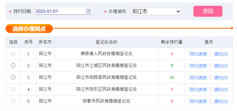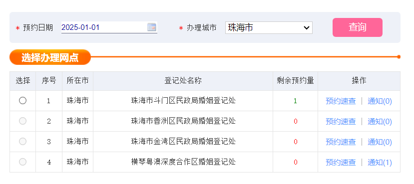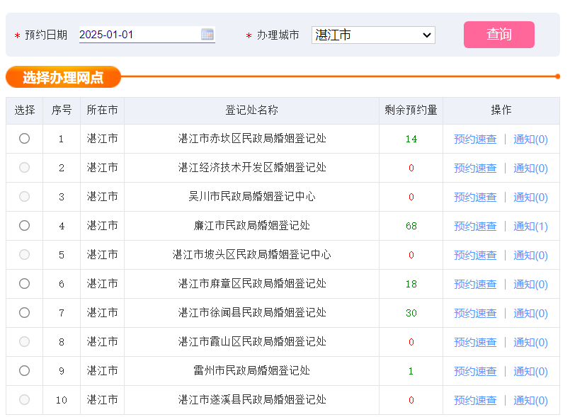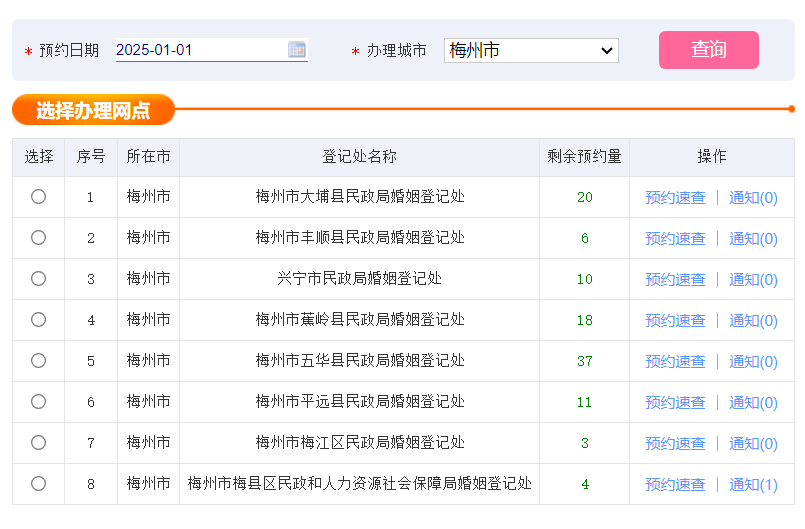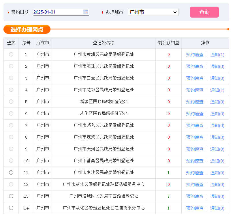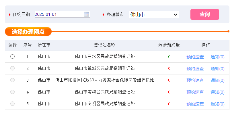 12月24日约13时,记者通过广东省婚姻登记网上预约系统查询到,省内部分地区仍有部分婚姻登记处可预约元旦当日进行婚姻登记。部分地区除网上预约外,市民也可通过现场轮候的方式进行办理,在办理完已在网上预约的登记需求后,婚姻登记机关将办理现场预约的登记需求,市民可通过电话咨询等方式再进行确认。