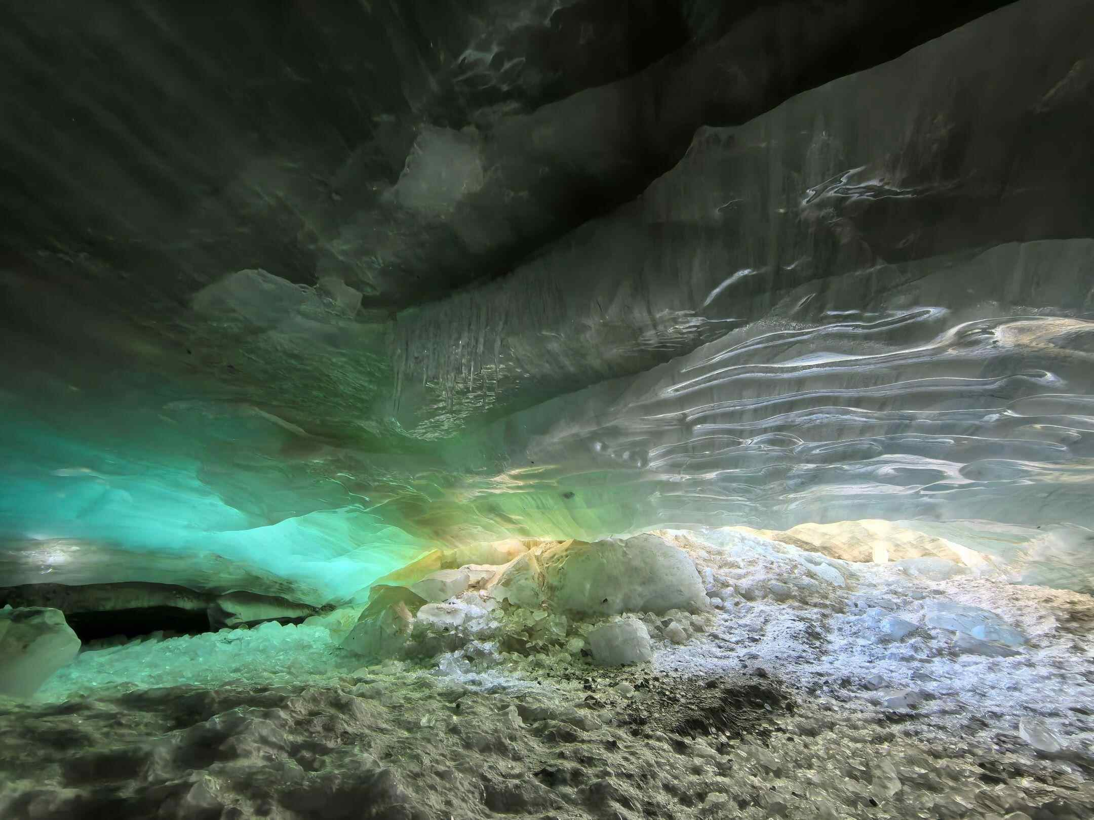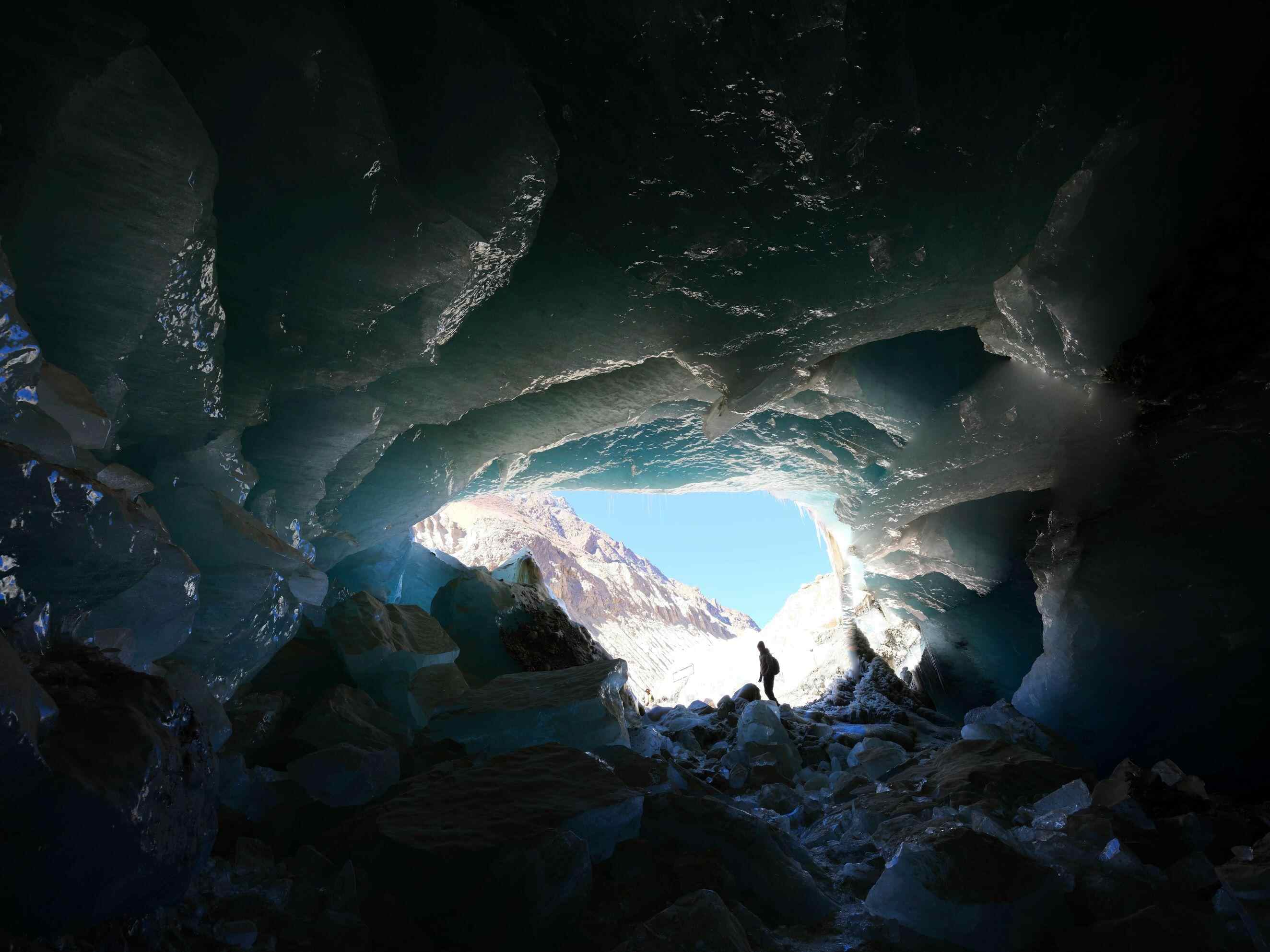 经初步勘测,该冰洞深度约152米,宽约18.2米,高约6.6米。整体呈弧拱造型,冰壁晶莹剔透,冰体形态各异,在阳光的照射下,散发出湛湛蓝光,仿佛一个梦幻的蓝色世界。