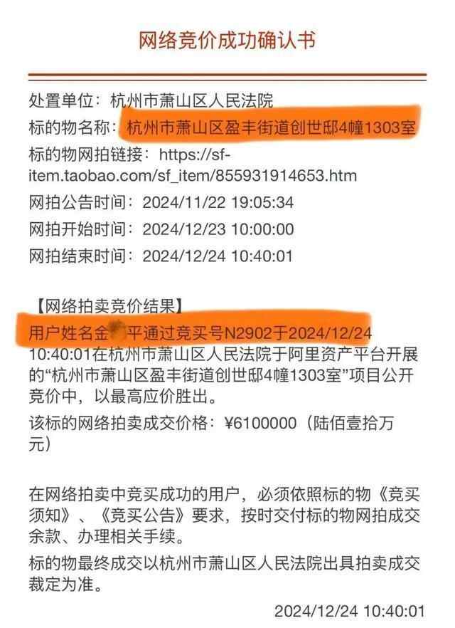 事实上,之后,两人还在继续扫货杭州优质法拍房。11月19日,蔡某某以781.34万元拍下城西的河滨之城雨澜轩一套法拍房,折合单价约5.64万元。再加上这套创世纪,两人已经投入6300多万元,购入了6套杭州法拍房。