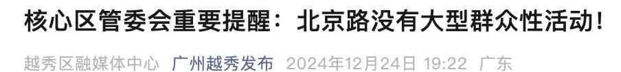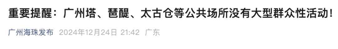 2025年元旦将至,12月24日晚、 12月 25日及跨年夜,广州塔、琶醍、太古仓等公共场所没有组织任何形式的大型群众性活动 。公安部门届时将视情对以上场所采取治安管控措施及临时交通管控措施,请市民群众留意相关官方发布,提前做好出行规划。