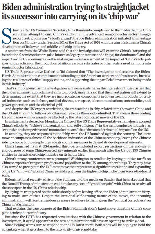 原标题:Biden administration trying to straightjacket its successor into carrying on its 'chip war'