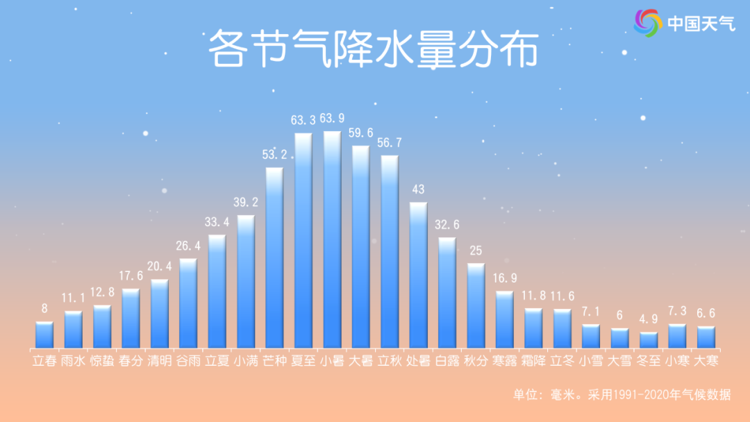 从常年来看,随着冬季风占主导,冷空气活跃,我国平均降水量在冬季明显减少。从小雪节气开始,全国平均降水量不足10毫米,随后持续下降,到冬至节气跌至谷底,迎来降水最少的时段。