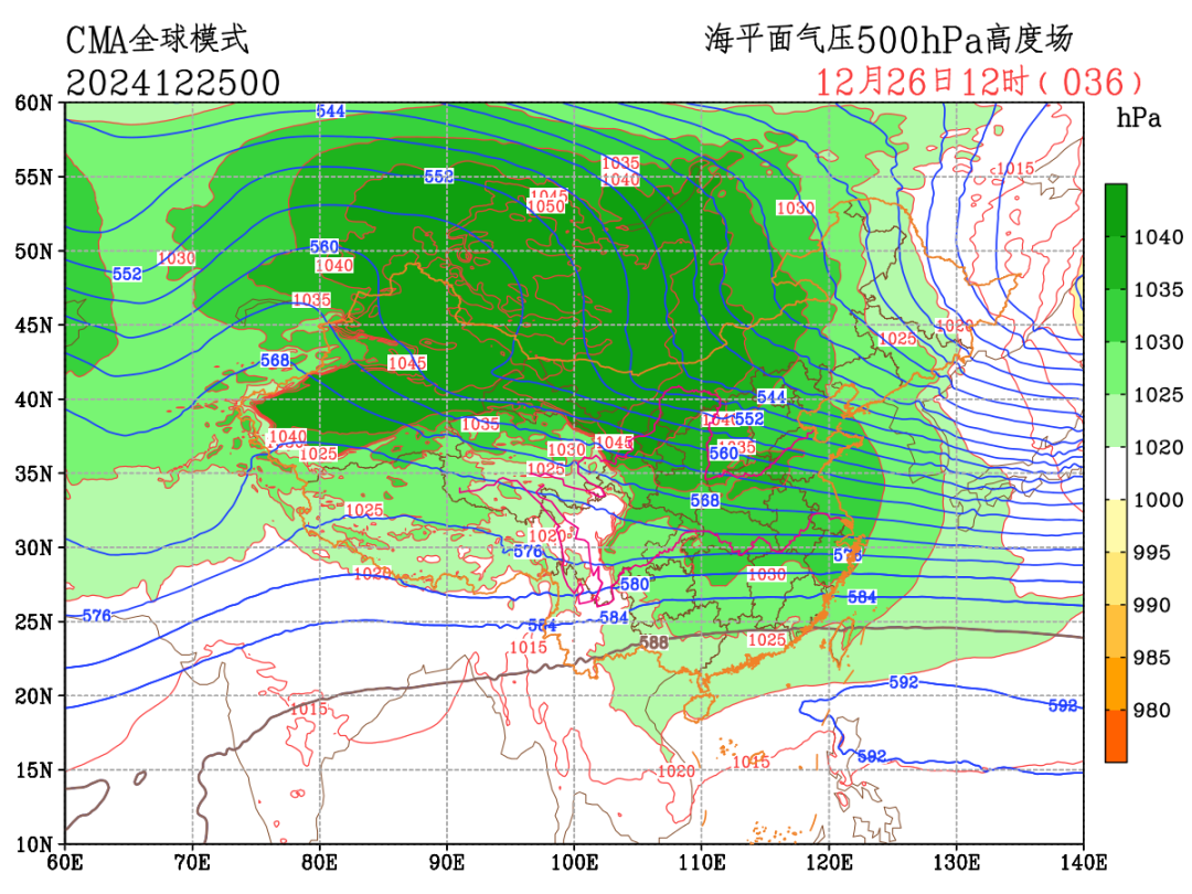 25日至27日,新一股冷空气又影响我国,图中深绿色部分为冷空气主体。