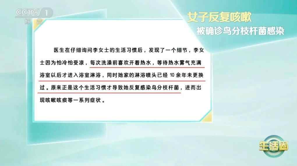 李女士洗澡时因怕冷怕受凉,所以每次洗澡前喜欢开着热水,等待热水雾气充满浴室以后才进入浴室淋浴,同时她家的淋浴喷头已经10余年未更换过,结果导致她反复感染鸟分枝杆菌,进而出现咳嗽咳痰等一系列症状。