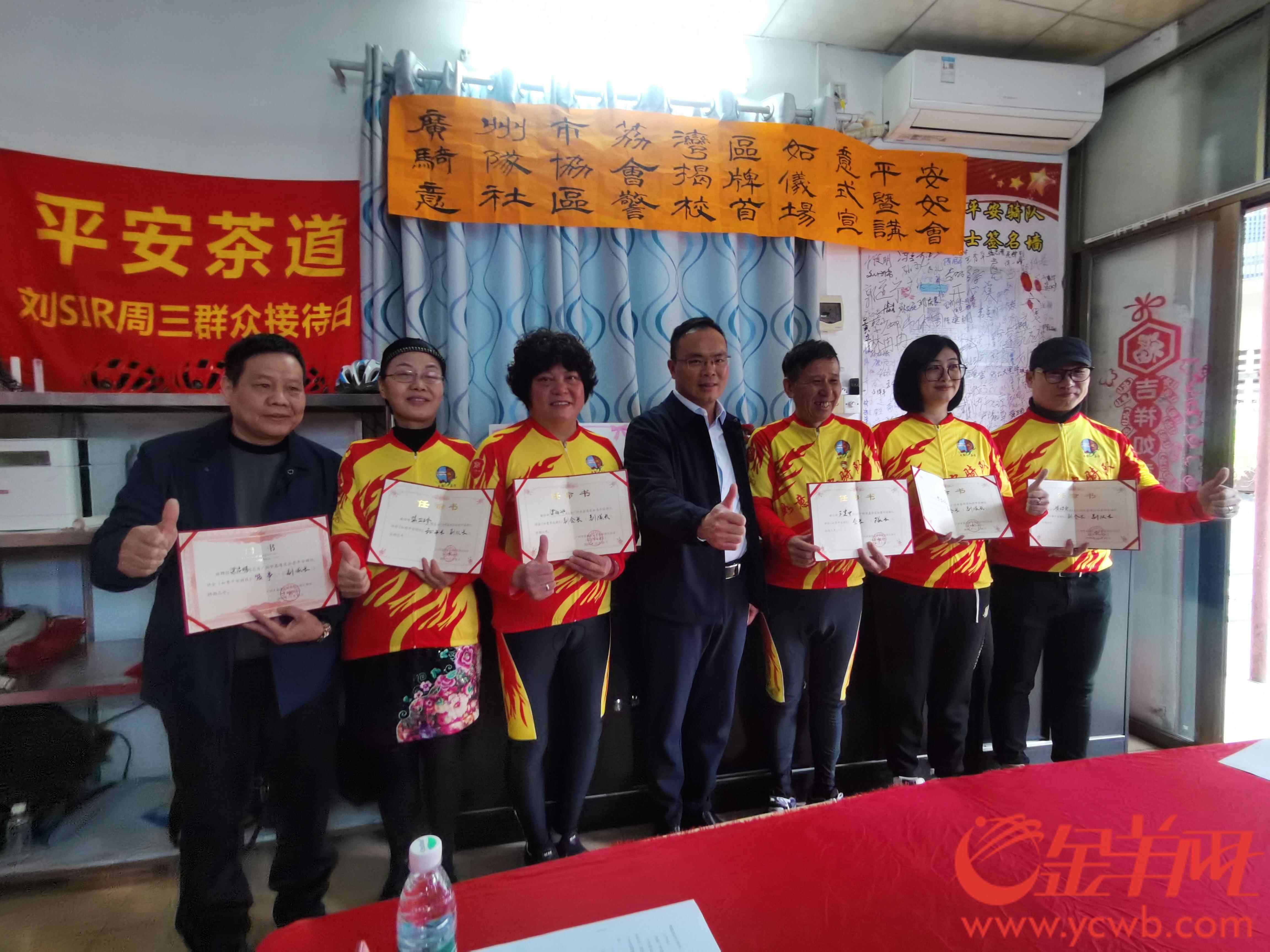 揭牌仪式上,荔湾区石围塘街道相关领导向如意平安骑队协会会长王建中,副会长梁丽冰、黎卓妮、黄昭宏,秘书长蓝卫珍,监事梁启明颁发证书;向陈毅恩颁发顾问聘书,向如意平安骑队创始人刘少廷、九零新媒体(深圳)有限公司董事长王林颁发荣誉会长证书。