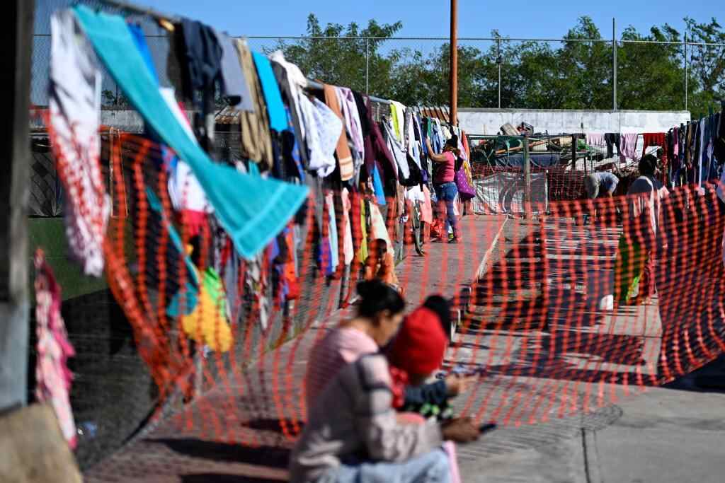 12月11日,在墨西哥边境城市雷诺萨的一处移民收容所里,人们晾晒衣物。新华社记者李木子摄