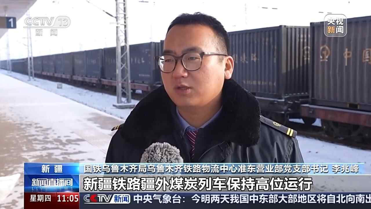 国铁乌鲁木齐局乌鲁木齐铁路物流中心准东营业部党支部书记 李兆峰:冬季以来新疆铁路疆外煤炭列车保持高位运行,每日发送29万吨以上,运力水平同期增长了50%,今年铁路疆煤外运量超9000万吨,同比增长了约5成。