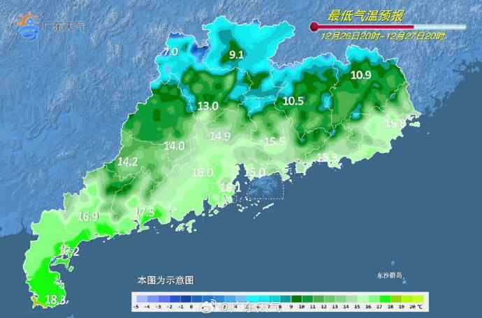 今日(12月27日)起,一股中等偏弱冷空气将从偏西路的方向补充影响广东。本周末全省平均气温下降3~5℃,29日早晨达到过程最低气温,预计粤北和珠三角北部降至2~5℃,晴冷天气回归。
