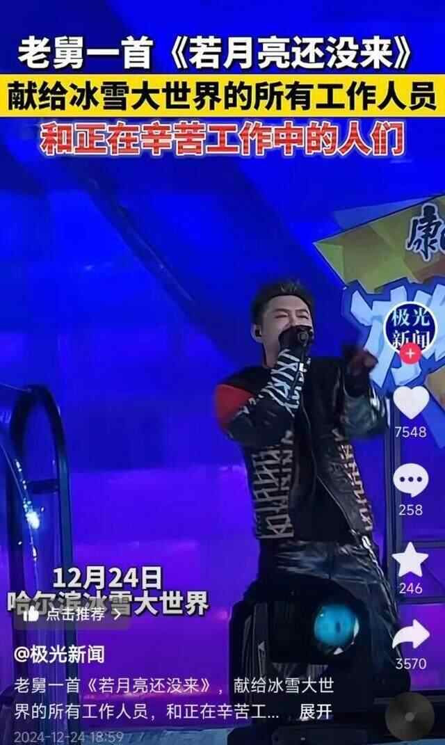 社交平台上多个视频显示,12月24日当天,“宝石老舅”亮相哈尔滨冰雪大世界参加某音乐节,现场演唱了《若月亮没来》等7首歌曲。哈尔滨冰雪大世界工作人员证实,近日的确有一场音乐会在此举行,并邀请了多位知名歌手。当地媒体极光新闻转发了“宝石老舅”当天在现场的表演视频。