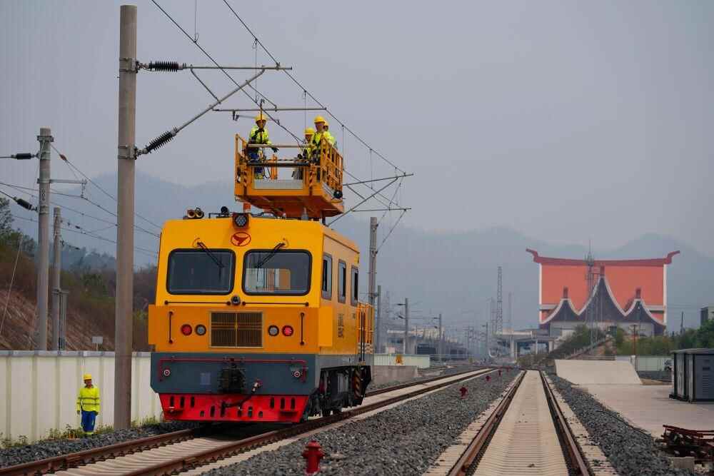 2023年4月17日,琅勃拉邦维保管理中心的工人在老挝琅勃拉邦站附近进行接触网维修保养演练。新华社记者邢广利摄