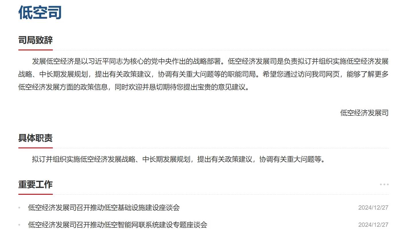 据官网介绍,低空司具体职责为:拟订并组织实施低空经济发展战略、中长期发展规划,提出有关政策建议,协调有关重大问题等。