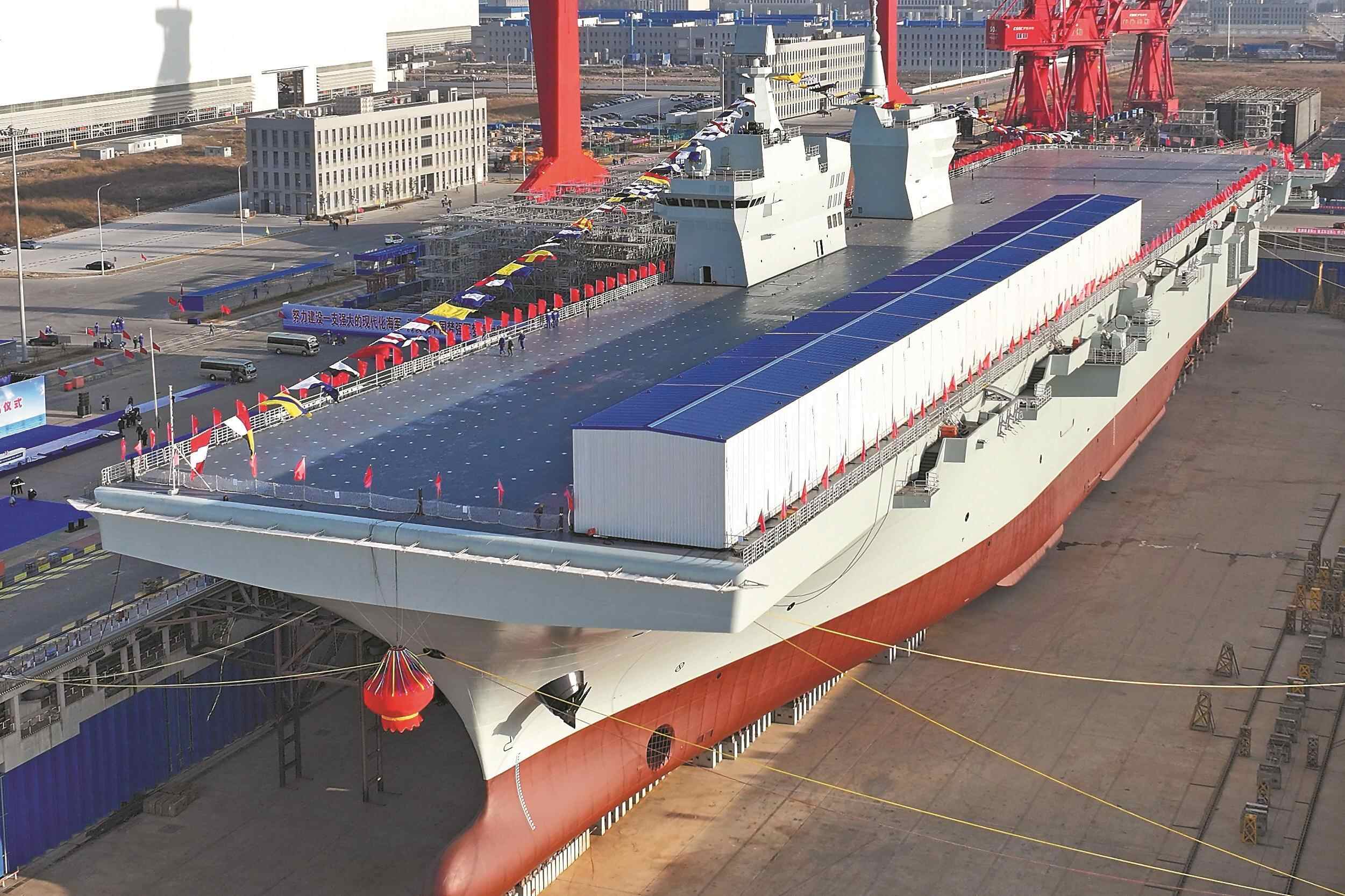 经中央军委批准,076两栖攻击舰首舰命名为“中国人民解放军海军四川舰”,舷号为“51”。四川舰满载排水量4万余吨,设置双舰岛式上层建筑和全纵通飞行甲板,创新应用了电磁弹射和阻拦技术,可搭载固定翼飞机、直升机、两栖装备等,是海军新一代两栖攻击舰,是推进海军转型建设发展、提升远海作战能力的关键装备。该舰下水后,将按计划开展设备调试、系泊试验、航行试验等工作。