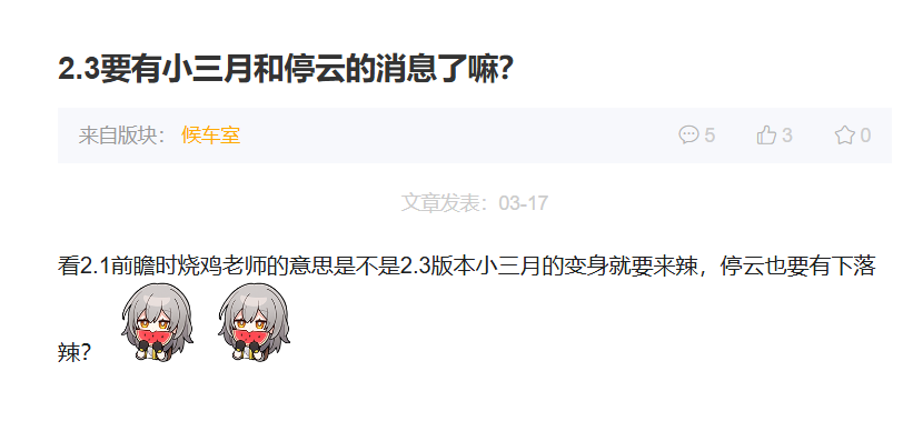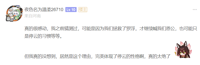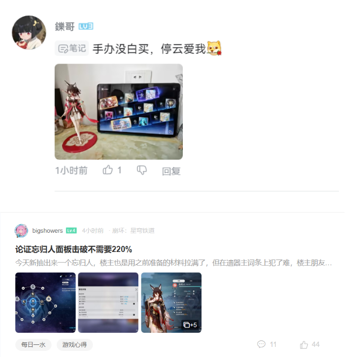 本就有很多玩家早就开始惦记着停云的回归,甚至有人提前一个版本就准备起了养成材料和遗器,这次看到新剧情对忘归人的塑造后,社区反响更加热烈,从晒卡到讨论攻略的帖子源源不断。