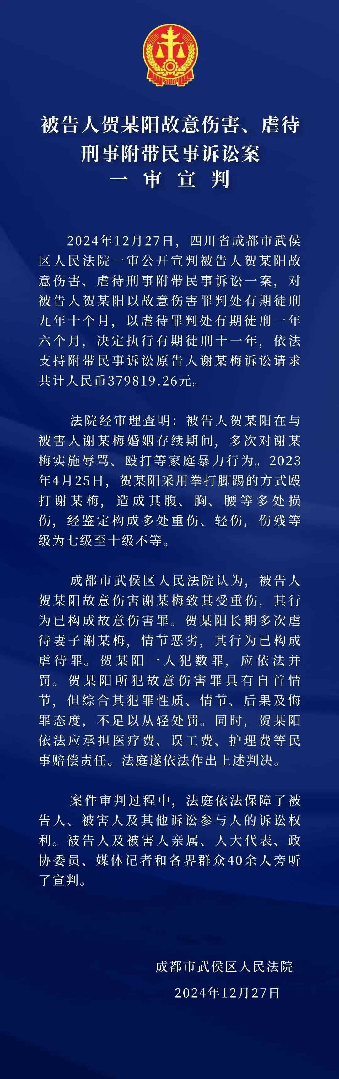 12月27日,四川成都男子贺某阳因两年内多次家暴妻子被控故意伤害罪、虐待罪一案一审开庭宣判。据成都市武侯区人民法院通报,一审判决认定,被告人贺某阳犯故意伤害罪和虐待罪,判处有期徒刑11年。新京报记者从被害人小谢的诉讼代理人姚克枫处获悉,贺某阳当庭表示将上诉。