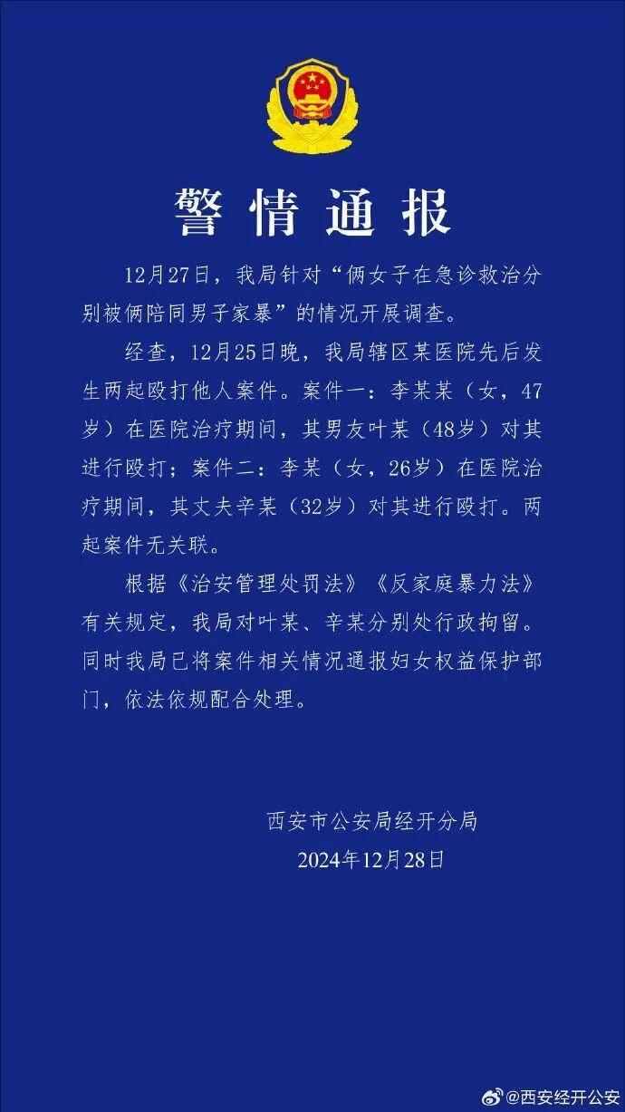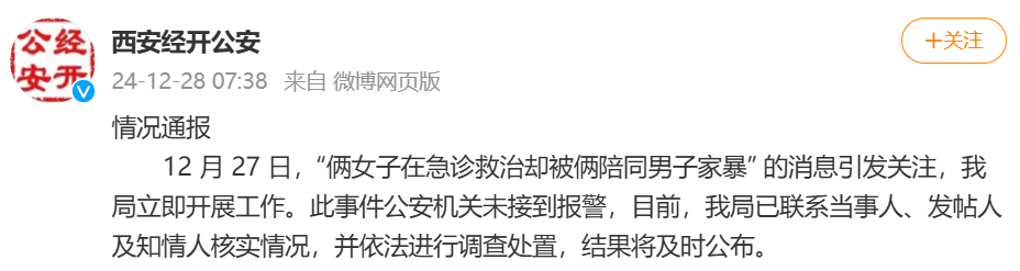 12月28日,西安市公安局经开分局发布警情通报。通报称,12月27日,经开分局针对“俩女子在急诊救治分别被俩陪同男子家暴”的情况开展调查。