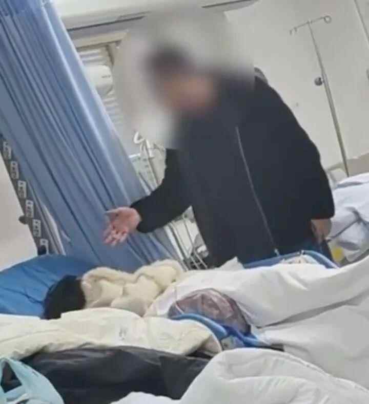 视频中,一中年男子,对病床上的黄衣女子扇耳光、拽头发。