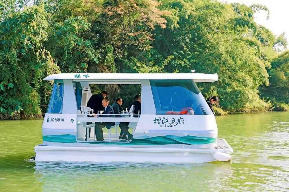 据了解,最美增江游项目一期铺设两艘亲子游船、一艘智能游船、一艘水上超级空间和四艘富有文化特色的画舫船。其中:亲子游船以亲子互动为主题,设有娱乐、游戏互动、科普教育等项目,是体验亲子水上乐趣和水上研学的首选;智能游船配置L4级智能驾驶系统,提供咖啡、下午茶等休闲体验,适合朋友聚会休闲娱乐;水上超级空间配备KTV、智能音箱、咖啡机、智能语音系统、躺椅、沙发、高脚椅等,可定制生日派对、企业团建、朋友聚会、情侣约会、商务洽谈等活动;画舫船可为团队提供水上观光游览,定制古装水上拍照项目,融合当地传统文化元素,让游客身临其境感受增江历史底蕴。