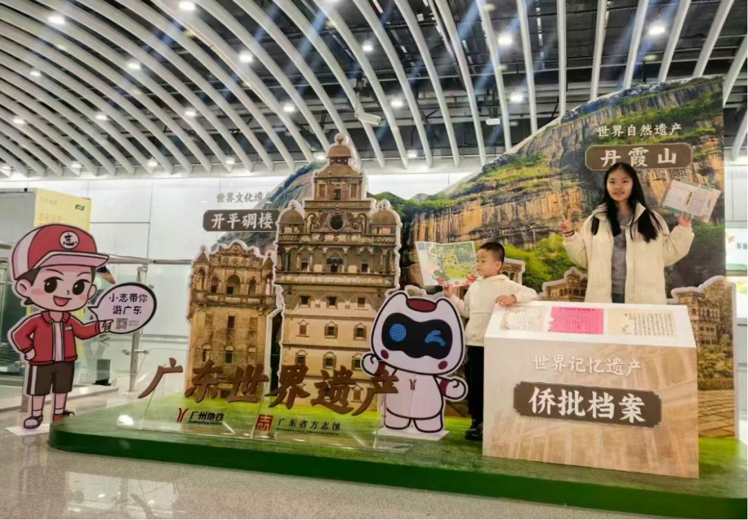 广东地处中国南大门,拥有得天独厚的自然和文化资源底蕴。“广东世界遗产”场景用图片立牌的形式将广东三大世界遗产“中国丹霞”“开平碉楼与村落”“侨批档案”搬进地铁,让广大市民在环线内就领略到广东独特的地域文化瑰宝。