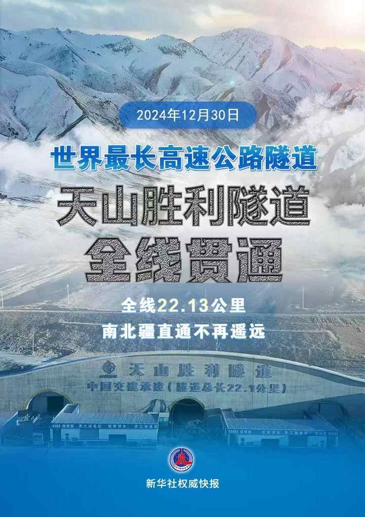 天堑变通途!2024年12月30日11时许,天山深处传来欢呼声,世界最长高速公路隧道——天山胜利隧道全线贯通。通车后,阻隔新疆南北的天山峻岭,穿越仅需20多分钟。