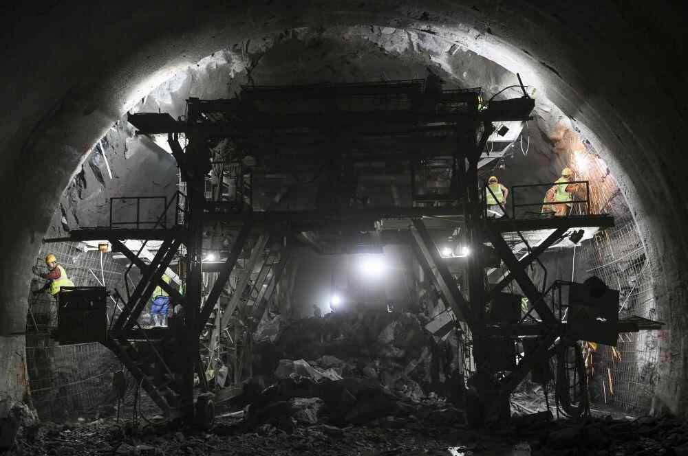 工人在新疆天山胜利隧道内施工(12月25日摄)。新华社记者 胡虎虎 摄