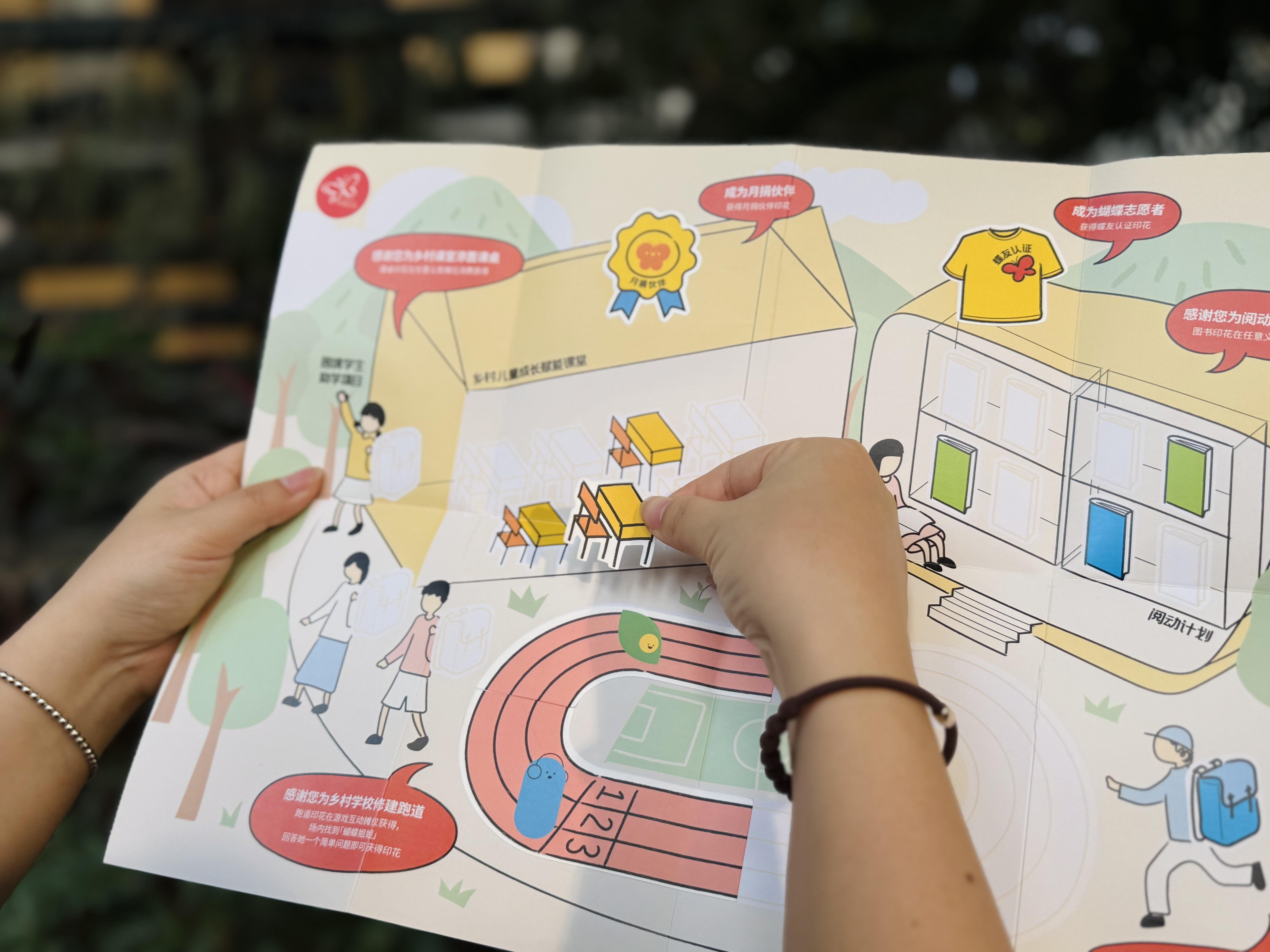 本次活动现场设置了多个具有公益元素的互动环节,活动参与者参加乐捐即可获得一份《印花收集册》,再通过参加义卖、注册志愿者、加入月捐、抱抱“大福”、玩蛇年主题游戏、与艺术IP合照等有趣的打卡环节,就能收集到多枚特别设计的“公益印花”,印花集齐后,一张完整的“乡村助学地图”呈现眼前——每一分善款将化为“跑道”、图书室、书包等物资,让乡村儿童也能获得公平的教育机会和丰富的学习资源。