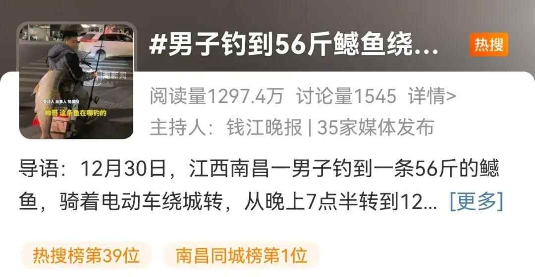 12月30日晚,“男子钓到56斤鳡鱼绕城5小时炫耀”的词条,冲上热搜。