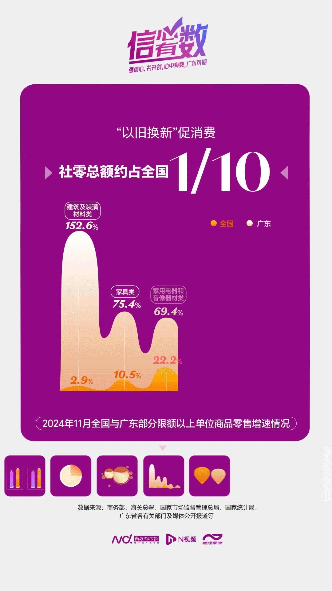 “以旧换新”政策效应持续显现,消费升级类商品零售保持较快增长。今年11月,广东限额以上单位家用电器和音像器材类、文化办公用品类、体育娱乐用品类零售分别增长69.4%、25.0%、18.2%;限额以上单位建筑及装潢材料类、家具类分别增长152.6%、75.4%,均远超全国增幅,彰显广东市场的强大潜力。
