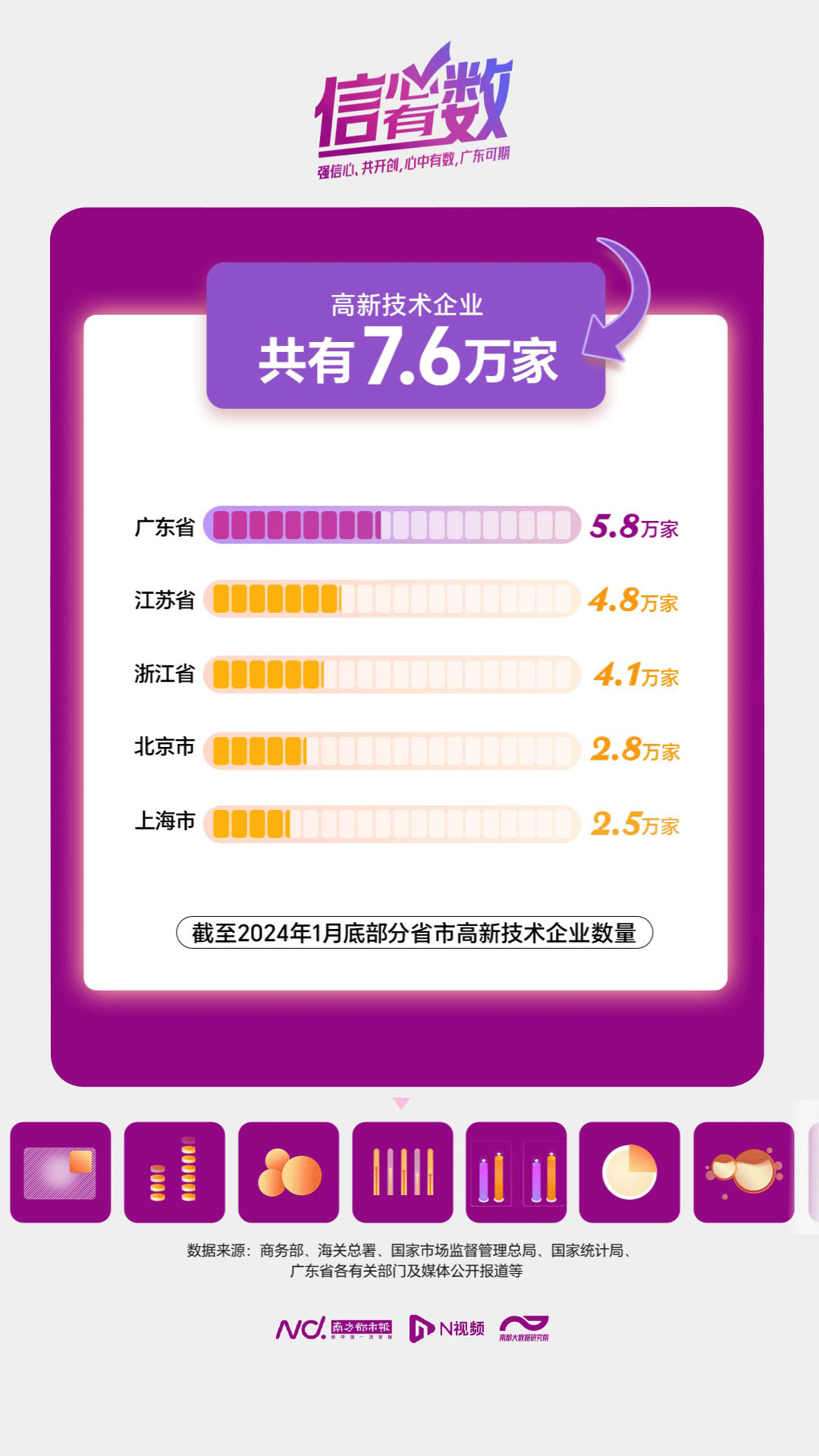企业创新能力强、创新主体作用突出,是广东区域创新体系的一大特色。作为发展新质生产力主力军的企业不断扩容提质,目前广东已有7.6万家高新技术企业,2089家专精特新“小巨人”企业,190家国家级制造业单项冠军企业。