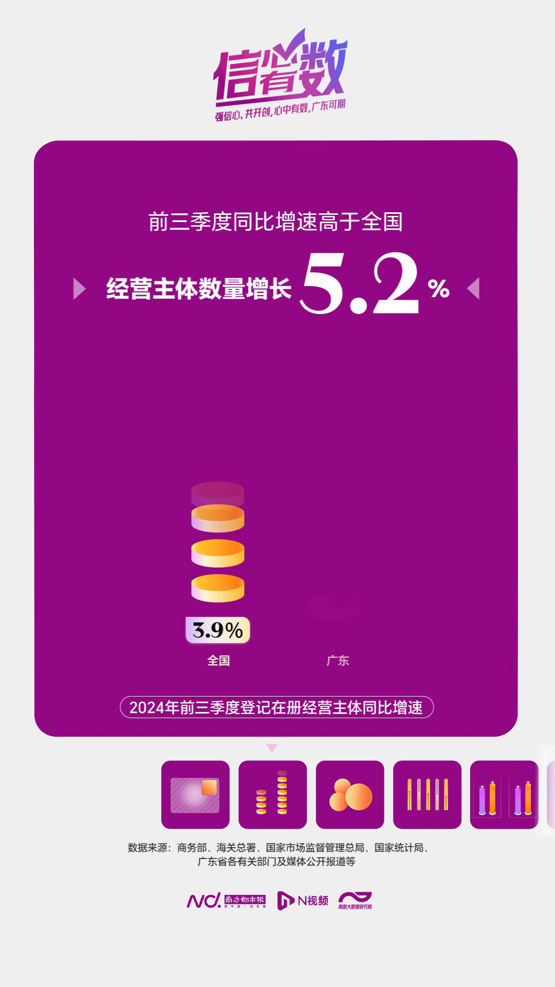 广东经济的活力,涌现自“涨”势喜人的经营主体。在一系列提振信心、促进民营经济发展、激发各类经营主体活力等政策措施的引领和带动下,广东经营主体内生动能持续增强,总量持续增加。据广东省市场监督管理局统计,2024年前三季度,全省新设经营主体215.25万户;至9月末,全省登记在册经营主体1880.78万户。南都大数据研究院对比去年同期数据,发现今年前三季度广东经营主体数量同比增长6.5%,远超全国增幅。